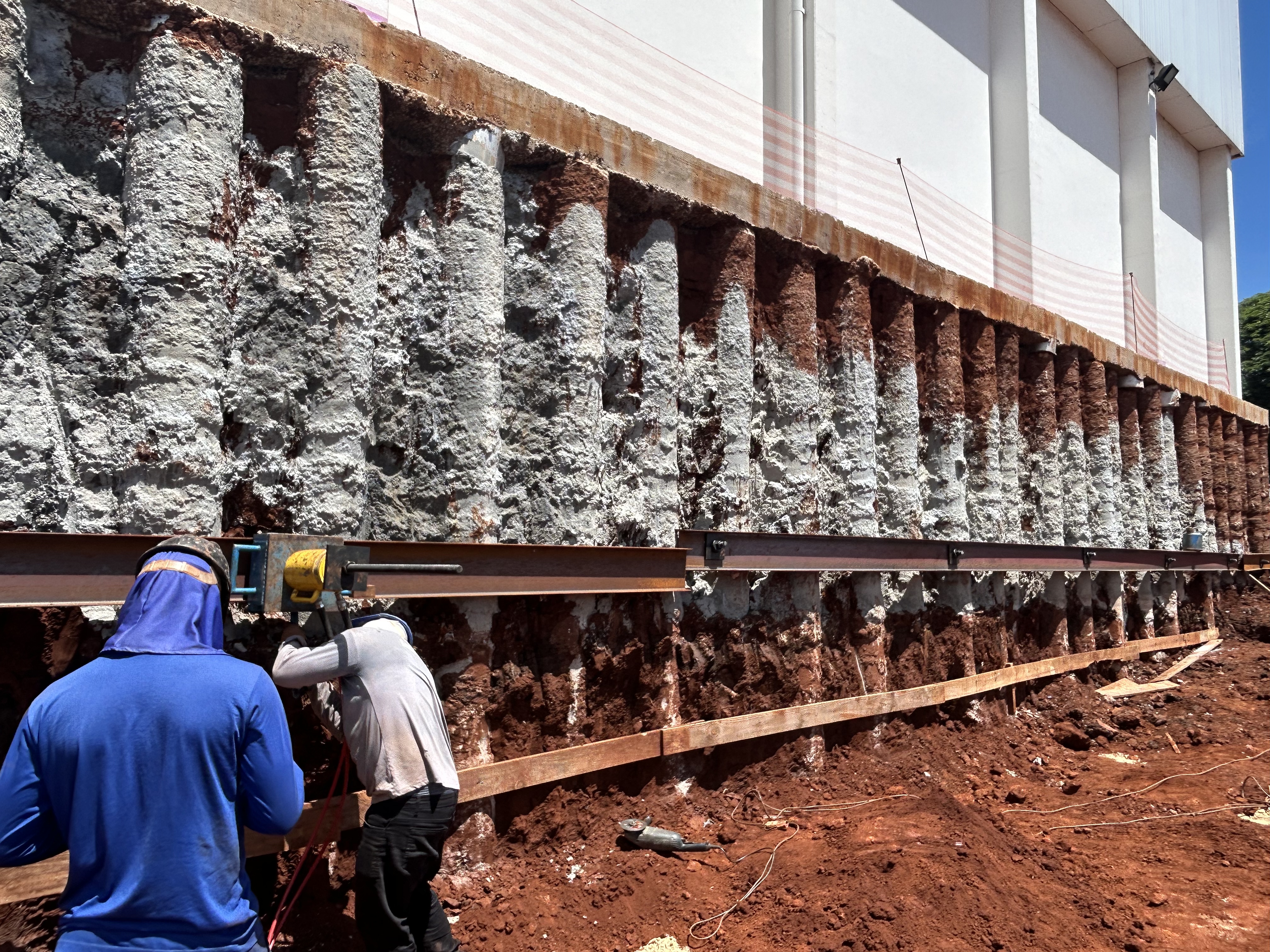 1479 metros lineares de estacas 40cm perfuradas e 26 tirantes protendidos com 15 metros de profundidade cada.